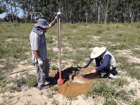 A rotina de campo envolve caminhar sistematicamente pelo terreno, observando atentamente a superfície do solo e registrando as características da paisagem. Em intervalos regulares, realizamos perfurações no solo— os chamados poços-teste — que permitem analisar os sedimentos e verificar se existem vestígios arqueológicos abaixo da superfície.